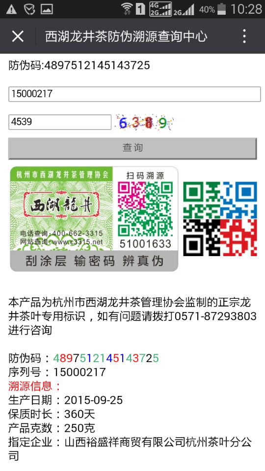 特點說明:此處的追溯信息不詳細是因為掃描的這個標簽是我們車間的半成品,未經(jīng)龍井茶管理機構(gòu)錄入更加詳細的信息。