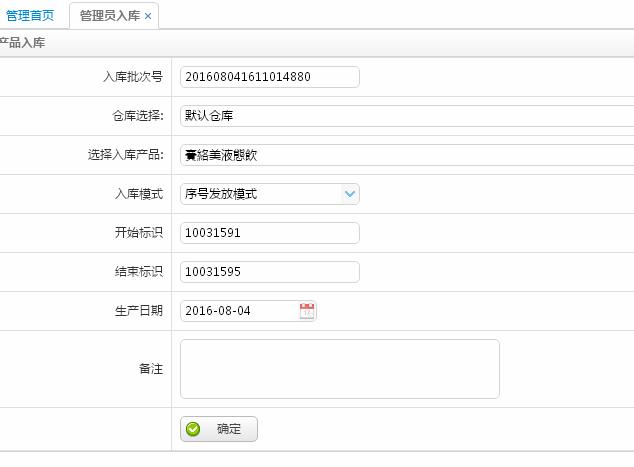 入庫(kù)管理中,倉(cāng)庫(kù)選擇默認(rèn)倉(cāng)庫(kù),選擇相應(yīng)的產(chǎn)品,入庫(kù)模式很重要,是選擇序號(hào)發(fā)放模式,只有選擇此項(xiàng),后面才有開始標(biāo)識(shí)和結(jié)束標(biāo)識(shí)。號(hào)碼段是從小到大。