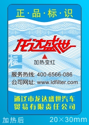 在防偽標簽印刷制作過程中,通過絲印將溫變熱敏油墨印在指定的標簽上,從而實現其防偽功能。樣標如下: