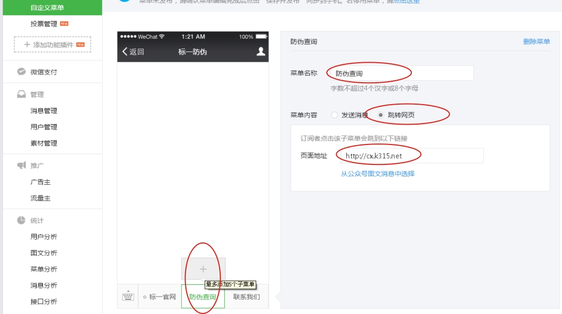 添加的鏈接可以是默認防偽查詢地址http://cx.k315.net(手機版),也可以是專門制作的網頁,也可以企業自己微網站的某一頁面。